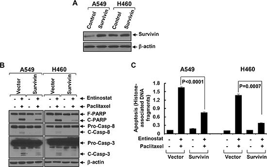 Figure 3: Ectopic expression of Survivin significantly attenuates entinostat potentiation of paclitaxel-induced apoptosis. A549 and H460 cells infected with lentivirus containing either control vector pLEX-MCS (Control) or pLEX-hSurvivin (Survivin) were subjected to the following experiments. (A) Western blot analyses of Survivin or β-actin. (B and C) Cells were then treated with combinations of entinostat (3 μmol/L and 0.5 μmol/L for A549 and H460, respectively) and paclitaxel (6 nmol/L and 3 nmol/L for A549 and H460, respectively) for 24 h. Cells were collected and subjected to western blot analyses of PARP (F-PARP, full length PARP; C-PARP, cleaved PARP), caspase-8 (Pro-Casp-8, pro-caspase-8; C-Casp-8, cleaved caspase-8), caspase-3 (Pro-Casp-3, pro-caspase-3; C-Casp-3, cleaved caspase-3), or β-actin (B), or apoptotic-ELISA (C). Bars, S.D.