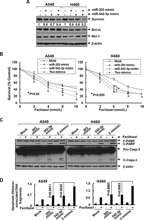 Figure 5: MiR-203 and/or miR-542-3p mimics specifically downregulate Survivin and significantly enhance paclitaxel-induced growth inhibition and apoptosis in NSCLC cells. A549 and H460 cells were either mock transfected or transfected with miR-203 mimic (40 nmol/L), or miR-542-3p mimic (10 nmol/L), or combinations of two miRNA mimics. (A) After 24 h, some cells were harvested and subjected to western blot analyses of Survivin, Bcl-xL, Mcl-1, or β-actin. The densitometry analyses of Survivin signals were shown underneath, and the arbitrary numbers indicate the intensities of each cell line relative to controls, defined as 1.0. (B) Some transfected cells were then plated onto 96-well plates and incubated for 24 h. The culture media were then replaced with either fresh media or the same media containing indicated concentrations of paclitaxel for additional 72 h. The percentages of surviving cells from each cell line relative to controls, defined as 100% survival, were determined by reduction of MTS. (C and D) Some transfected cells were then untreated or treated with paclitaxel (6 nmol/L and 3 nmol/L for A549 and H460, respectively) for 24 h. Cells were collected and subjected to western blot analyses of PARP, caspase-3, or β-actin (C), or apoptotic-ELISA (D). Bars, S.D. Data show the representative of three independent experiments.