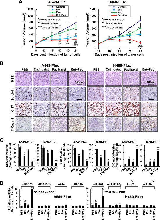 Figure 7: Entinostat in combination with paclitaxel significantly inhibits in vivo tumor growth of NSCLC cells. A549-Fluc or H460-Fluc cells were subcutaneously inoculated into nude mice to establish tumor xenografts. The tumor-bearing mice received i.p. injections of either PBS, or entinostat (25 mg/kg for A549-Fluc, 12.5 mg/kg for H460-Fluc), or paclitaxel (7.5 mg/kg) alone, or both entinostat and paclitaxel as described in Methods. After five treatments, all mice were euthanized and their tumors were excised for histology, IHC, and miRNAs expression analyses. (A) The graphs show the tumor growth curves. Bars, S.D. (B) Data show the representative tumors with H&E staining and IHC analysis of Survivin, Ki-67, and cleaved caspase-3 (C-Casp-3). (C) The IHC slides were observed by two independent personnel. The tumor cells with positive staining of Survivin, Ki-67, or cleaved caspase-3 were counted from three randomly selected areas in each slide. The three areas were first identified by scanning the entire slide at × 100 magnification, and then the positive-stained cells were counted at × 200 magnification using an Olympus BX40 microscope. The bar graphs show the average of positive staining cells in each field. Bars, S.D. P values versus control were indicated. *P < 0.01, **P < 0.001. (D) Isolated tumors were immersed in RNA safer reagent and subjected to total RNA extraction, inclusive of the small RNA fraction. The expression levels of miR-203, miR-542-3p, Let-7c, and miR-29b were measured by qRT-PCR. All results were normalized with the internal control RNU6B. Bars, S.D. Data show the representative of three independent experiments.