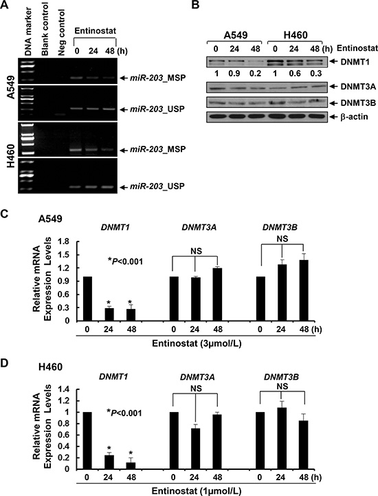 Figure 8: Entinostat demethylates miR-203 promoter in NSCLC cells correlated with the downregulation of both protein and mRNA levels of DNMT1 in vitro. A549 and H460 cells were untreated or treated with entinostat (3 μmol/L for A549, 1 μmol/L for H460) for 24 or 48 h. (A) Some cells were collected and subjected to DNA extraction. Methylation-specific PCR (MSP) and unmethylation-specific PCR (USP) analyses of miR-203 promoter were performed as described in Methods. Blank control, double distilled H2O as PCR template. Negative control, unconverted genomic DNA of A549 or H460 cells as PCR template. (B) Some cells were subjected to western blot analyses of DNMT1, DNMT3A, DNMT3B, or β-actin. The densitometry analyses of DNMT1 signals were shown underneath, and the arbitrary numbers indicate the intensities of each cell line relative to controls, defined as 1.0. (C and D) One third of the cells were subjected to total RNA extraction. The mRNA levels of DNMT1, DNMT3A, and DNMT3B were measured by qRT-PCR. All results were normalized with the internal control β-actin. Bars, S.D. Data show the representative of three independent experiments. NS, no significance.