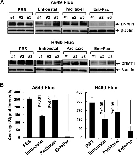 Figure 9: Entinostat reduces the expression of DNMT1 and its combination with paclitaxel exerts more potent inhibitory effects on DNMT1 in vivo. (A) Tumor tissues obtained from the animal studies (Figure 7) were homogenized to generate protein lysates. Equal amount of the total lysates from three tumors of each treatment group were used for western blot analysis of DNMT1 or β-actin. (B) DNMT1 signal intensities of the tumors were obtained by densitometry analyses. The average signal intensity of each group was shown. Bars, S.D.