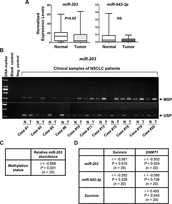Table 1: The relative mRNA abundance of miR-203, miR-542-3p, Survivin, and DNMT1, as well as the methylation status of miR-203 promoter in the clinical samples of NSCLC patients