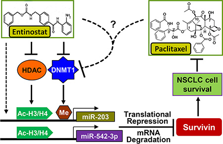 Paclitaxel has long been used to treat NSCLC either as single agent or combined with other therapeutics [14, 15]. However, resistance to paclitaxel remains one of the main causes of treatment failure in NSCLC [16]. It is of particular significance to elucidate the underlying mechanism of paclitaxel resistance and identify new strategy to abrogate it. Here, we showed that epigenetic silencing of miR-203, leading to Survivin overexpression, played a key role in determining the sensitivity of NSCLC cells to paclitaxel. The HDACi entinostat selectively reduced Survivin via induction of miR-203 and miR-542-3p, and thereby significantly enhanced paclitaxel-induced apoptosis in NSCLC cells. However, induction of miR-542-3p by entinostat was observed in vitro, not in vivo. Clinical analysis found no difference of miR-542-3p levels between NSCLC tumors and the normal lung tissues. There was no correlation between the expression of miR-542-3p and mRNA levels of either Survivin or DNMT1 (Figure 11A and 11D). These data suggest that 1) increased DNMT1 may not alter miR- 542-3p expression in NSCLC; 2) although miR-542-3p contributes to entinostat-induced growth inhibition and apoptosis in vitro, it has little effect on entinostat potentiation of paclitaxel efficacy in vivo. Collectively, our studies indicate that inhibition of DNMT1 is at least one of the major mechanisms for entinostat to lift epigenetic silencing of miR-203, which results in downregulation of Survivin and thereby enhances paclitaxel-mediated antitumor activity against NSCLC (Figure 12).