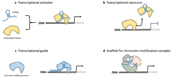 Figure 2: LncRNAs in epigenetic and transcriptional regulation. Four mechanisms of epigenetic and transcriptional regulation by lncRNAs are shown [18]. a. Direct interaction of lncRNAs with transcription factors (TFs) induces the allosteric change of the TFs towards activation. b. LncRNAs act as decoy for TFs by keeping them away from their targets on chromatin. c. LncRNAs act as a transcriptional guide by recruiting chromatin-modifying enzymes to target genes, either in cis or in trans to distant target genes. d. LncRNAs act as a scaffold, bringing together multiple proteins to form ribonucleoprotein complexes.
