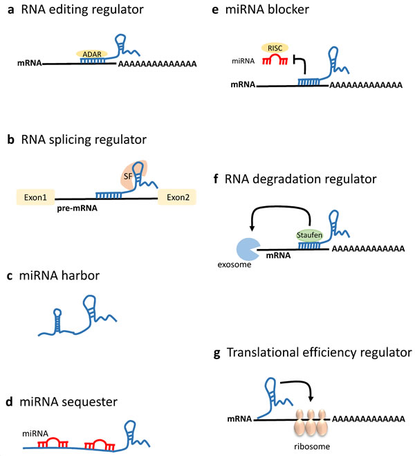 Figure 3: LncRNAs in mRNA processing and post-transcriptional regulation. LncRNAs can act post-transcriptionally modulating mRNA processing at multiple levels [19]. a. Antisense lncRNAs associate with the sense mRNA, and the resultant RNA:RNA duplex might direct mRNA editing recruiting ADAR (adenosine deaminase acting on RNA) enzymes that catalyze adenosine to inosine conversion in double-stranded RNA. b. LncRNAs can prevent the alternative splicing of a pre-mRNA by binding the boundary site between its intron and exon. LncRNAs can also regulate RNA splicing by associating with splicing factors. c. LncRNAs may harbor the hairpin structure, which can give rise to the pre-miRNA. d. LncRNAs harboring the recognition site for functional miRNAs can function as miRNA decoys to sequester miRNAs from their mRNA targets. Furthermore, lncRNAs themselves can be the targets of miRNAs. e. LncRNAs can compete with miRNAs for binding on target mRNAs thus blocking miRNA-induced silencing through the RNA-induced silencing complex (RISC) and increasing mRNA translation. f. LncRNAs can regulate mRNA stability forming lncRNAs:mRNA double-stranded structures that can direct exosome mediated RNA degradation. For instance, Alu repeat-containing lncRNAs can associate with the Alu elements in the 3’ untranslated region (UTR) of an mRNA, and the resultant double-stranded structure can direct Staufen-mediated decay, thus destabilizing the target mRNA. g. LncRNAs association with the mRNA can positively or negatively modulate the translation efficiency, depending on the mRNA and lncRNA structures.