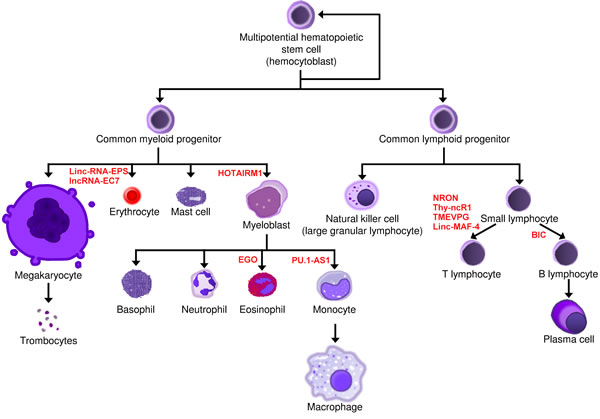 Figure 4: Involvement of lncRNAs in normal hematopoiesis. LncRNAs that regulate blood cell development are shown next to the cellular stage at which they act.