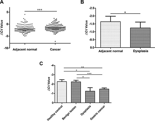 Figure 1: RMRP expression levels in gastric cancer tissues. (A) RMRP expression levels were downregulated in 68.2% gastric cancer tissues compared with the paired adjacent non-tumorous tissues. (B) RMRP expression levels were significantly decreased in gastric dysplasia tissues compared with the healthy control group. n = 28. (C) RMRP expression levels in the tissues from various stages of gastric carcinogenesis. RMRP expression was only significantly decreased in gastric dysplasia (n = 28) and gastric cancer tissues (n = 132) compared with healthy controls (n = 37) and benign lesions (n = 34). RMRP expression levels were detected by qRT-PCR. Smaller ΔCt value indicates higher expression. *P < 0.05, **P < 0.01, ***P < 0.001.