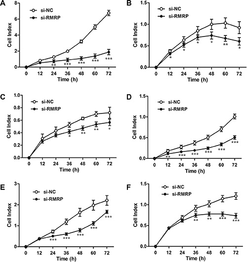 Figure 4: Results of cell proliferation after knockdown of RMRP. Real-time cell analyzer (RTCA) reports showed that cell growth was significantly impaired in the human normal gastric epithelial cell line GES-1 (A) and the gastric cancer cell lines AGS (B), BGC-823 (C), HGC-27 (D), MGC-803 (E) and SGC-7901 (F) transfected with si-RMRP. Data are presented as the mean ± SD, n = 16. *P < 0.05, **P < 0.01, ***P < 0.001.