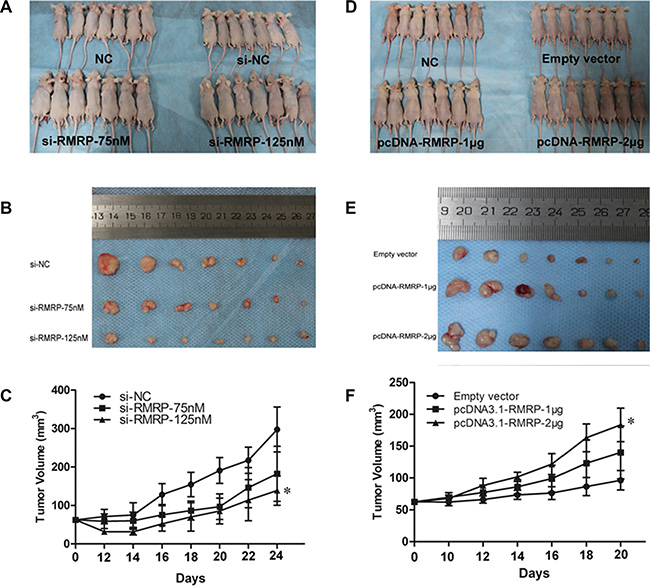 Figure 6: RMRP affects the growth and tumorigenicity of gastric cancer cells in vivo. (A-C) Knockdown of RMRP significantly inhibited tumor growth compared with the control group, as evidenced by the reductions in the dose-dependent tumor volume in the si-RMRP transfected group. (D-F) The growth of tumors transfected with pcDNA3.1-RMRP was obviously promoted in a dose-dependent manner. (A, D) Nude mice euthanized. (B, E) Gastric cancer tumor tissue from euthanized nude mice. (C, F) Tumor growth curve. n = 7. *P < 0.05.
