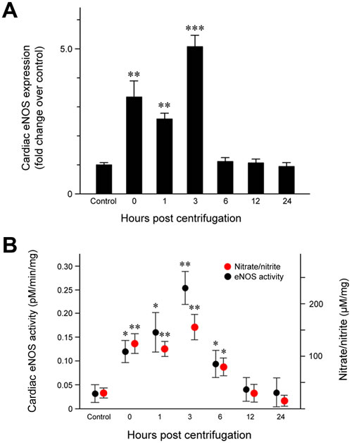 Figure 2: Effect of exposure to hypergravity on cardiac eNOS protein expression and enzymatic activity and NO production. A. Significantly elevated eNOS protein levels were observed from 1 to 3 hr post-exposure, with two peaks noted between 0 and 3 hr post-exposure. B. An L- [14C]-citrulline assay and a nitrate/nitrite assay showed similar trends in the levels of eNOS enzymatic activity and nitrate/nitrite concentration, both of which significantly increased from 0 hr to 6 hr post-exposure. Both parameters reached a peak at 3 hr post-exposure. *P < 0.05; **P < 0.01; ***P < 0.001.