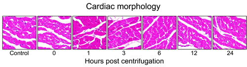 Figure 3: Representative photomicrographs of tissue sections obtained from hypergravity-exposed hearts. In all specimens, there was no definitive myocellular necrosis, compensatory hypertrophy or interstitial fibrosis. No significant inflammatory response was detected in the tissue of the myocardium.