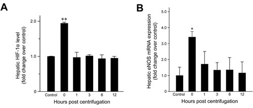 Figure 4: Effects of exposure to hypergravity on hepatic expression of HIF-1α and eNOS mRNA. A. HIF-1α expression increased significantly in the livers of the centrifuged mice immediately after exposure to hypergravity. This transient rise and rapid decrease were concordant with B. significantly elevated eNOS mRNA levels, which were observed at 0 hr post-exposure only. *P < 0.05; **P < 0.01.