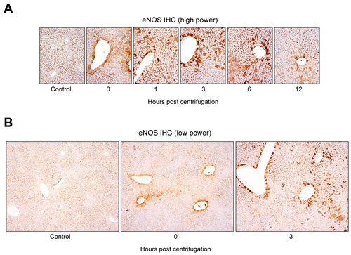 Immunohistochemical studies with antibodies against eNOS have localized the enzyme in various cell types in many tissues, including the liver [27]. Several experimental models of altered hepatic eNOS expression have emphasized the crucial role of this enzyme in diverse pathophysiological conditions of the liver. For example, lipopolysaccharide or lipoteichoic acid treatment of an in vivo sepsis model significantly increased eNOS mRNA expression [28]. Another study using a model of alcoholic liver injury revealed alcohol-related attenuation of eNOS activity in rats fed an ethanol-containing liquid diet [29]. Furthermore, rats with carbon tetrachloride-induced cirrhosis exhibit significantly lower hepatic eNOS activity than do control animals [30]. eNOS plays a role in microcirculatory and immunomodulatory responses during hepatic hypoxia/reoxygenation injury. In a mouse orthotopic liver transplantation experiment, eNOS-knockout mice exhibited more severe microcirculatory disturbances and hepatocellular necrosis following hepatic hypoxia/reoxygenation than their wild-type counterparts [31].