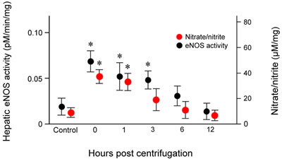 Hepatic nitrate/nitrite levels showed a trend similar to those of eNOS expression and activity (Figure 6). Nitrate/nitrite levels in liver tissue homogenates increased significantly immediately after exposure to hypergravity (P = 0.016). After a slight decrease at 1 hr post-exposure, the levels began decreased further up to 3 hr post-exposure, and continued to fall until they reached values similar to those of the control group at 12 hr post-exposure. None of the animals displayed remarkable behavioral changes during or after centrifugation.