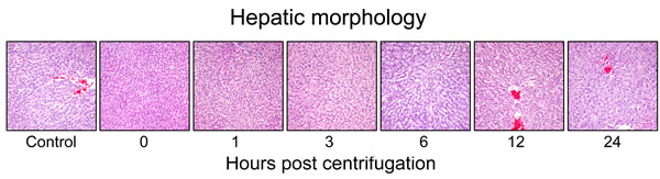 Representative photomicrographs are shown in Figure 7. The centrifuged mice showed no significant alterations in the size, shape or weight of their livers. No significant increase in fibrous connective tissue was observed in the centrifuged livers. There was no significant morphological changes in the centrifuged livers in comparison with those of the control group. The sinusoids were well preserved. No evidence of hepatocellular necrosis, hyperemia, hemorrhage or advanced degenerative change was detected.