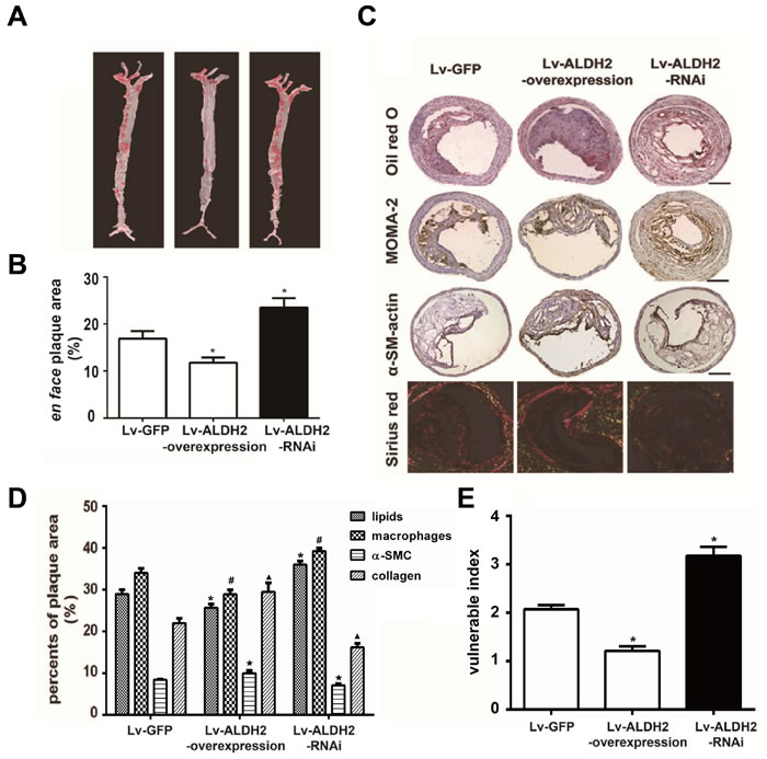 Figure 2: Changes of atherosclerotic plaques in aortas and carotid plaques composition in apoE-/- mice after lentivirus transfection. A. Representative en face photographs of aortas in three groups showing oil red O-stained atherosclerotic plaques. B. Quantitative measurement of en face plaque area (%) in the whole aorta. *: P < 0.05 vs Lv-GFP group. C. Representative Oil-red O staining, MOMA-2 immunostaining, α-SM-actin immunostaining and Sirius-red staining in three groups of the apoE-/- mice; the bars represent 100μm. D. Column graph of quantification of staining results in Figure 2C by Image-Pro Plus 6.0 Software. *, #, ★, ▲: P < 0.05, percent of lipids, macrophages, α-SMCs and collagen compared with Lv-GFP group, respectively. All data were presented as mean±SEM. E. Bar chart of vulnerable index in three groups of the apoE-/- mice. The vulnerability indexs in the Lv-GFP, Lv-ALDH2-overexpression and Lv-ALDH2-RNAi groups are 2.10±0.10, 1.40±0.10 and 3.20±0.19, respectively. *: P < 0.05 vs Lv-GFP group.