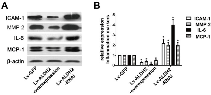 In the present study, we also examined the relationship between ALDH2 and inflammation in HUVECs treated with LPS in vitro. Our findings suggest that levels of two important inflammatory molecules, ICAM-1 and MCP-1, could be regulated by ALDH2, which was consistent with the in vivo results.
