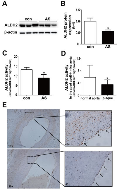 Figure 4: Expression and activity of ALDH2 in the vessels with or without atherosclerotic plaques. A. Representative blot of ALDH2 protein expression in human normal coronary arteries and atherosclerotic vessels. B. Statistical analysis of the data presented in Figure 4A. C. Histogram of ALDH2 activity in human normal coronary arteries and atherosclerotic vessels. D. Histogram of ALDH2 activity of old-aged apoE-/- mice aortas. E. Representative ALDH2 immunostaining in human coronary arteries. The arrows show that ALDH2 is expressed in endothelial cells. Con: normal coronary arteries, AS: atherosclerotic vessels. *: P < 0.05 vs control. The data were presented as mean±SEM.