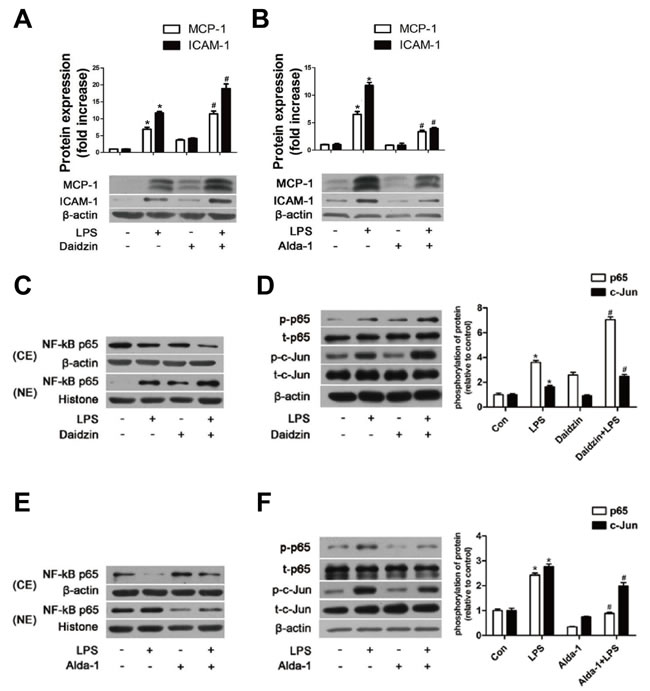 Figure 5: The effects of ALDH2 on MCP-1, ICAM-1, and NF-κB and AP-1 transcription factors in HUVECs. A. MCP-1 and ICAM-1 expression in HUVECs pre-treated with Daidzin before LPS treatment. B. MCP-1 and ICAM-1 expression in HUVECs pre-treated with Alda-1 before LPS treatment. Values are expressed as means±SEM from three independent experiments. *: P < 0.05 vs control. #: P < 0.05 vs LPS treatment alone. C. NF-κB P65 protein expression in HUVECs pre-treated with or without Daidzin before LPS treatment. D. Phosphorylation of NF-κB P65 and AP-1 c-Jun in HUVECs with or without Daidzin before LPS treatment. E. Protein expression of NF-κB P65 in HUVECs treated with or without Alda-1 before LPS treatment. F. Phosphorylation levels of NF-κB P65 and AP-1 c-Jun in HUVECs with or without Alda-1 before LPS treatment. Values are expressed as means±SEM from three independent experiments. *: P < 0.05 vs control. #: P < 0.05 vs LPS treatment alone.