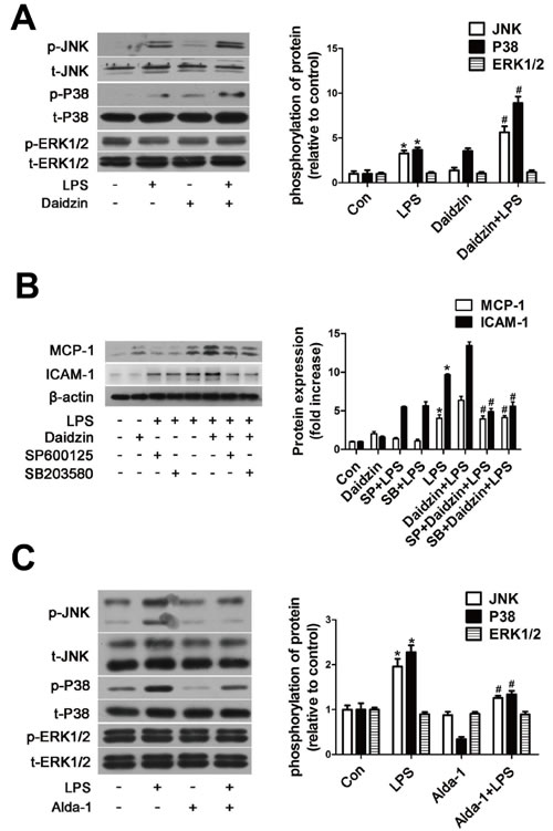 Figure 6: ALDH2 regulates expression of MCP-1 and ICAM-1 protein via JNK and P38 MAPK system in LPS-activated HUVECs. A. Phosphorylation of JNK, p38 MAPK and ERK1/2 in HUVECs stimulated by Daidzin before LPS treatment. *: P < 0.05 vs control. #: P < 0.05 vs LPS treatment alone. B. MCP-1 and ICAM-1 expression after SP600125 (20μm) or SB203580 (20μm) treatment before LPS stimulation in HUVECs. Con: control; SP600125: JNK inhibitor; SB203580: P38 inhibitor. *: P < 0.05 vs control. #: P < 0.05 vs LPS+Daidzin treatment. C. Phosphorylation of JNK, p38 MAPK and ERK1/2 in HUVECs stimulated by Alda-1 before LPS treatment. *: P < 0.05 vs control. #: P < 0.05 vs LPS treatment alone. All values are expressed as means±SEM from three independent experiments.