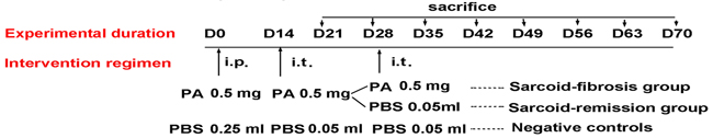 On day 0, 0.25 mL of the 2 mg/mL heat-killed PA suspension (a total of 0.5 mg) was injected intraperitoneally into mice. On day 14, mice were anesthetized with 1% sodium pentobarbital and challenged with 0.05 mL of the 10 mg/mL heat-killed PA suspension (a total of 0.5 mg) via the intratracheal route. PA inoculation and intratracheal challenge could induce sarcoid-granulomatosis in the lung. Sarcoidosis mice were given booster challenge on day 28 with another 0.05 mL of the 10 mg/mL heat-killed PA suspension (a total of 0.5 mg) intratracheally for a second challenge, these mice are sarcoid-fibrosis group. Giving 0.05 mL of sterile PBS on day 28 will show the natural disease course after once PA challenging on day 14, these mice were sarcoid-remission group. The mice were sacrificed at weekly intervals for 7 weeks after the final intratracheal injection. C57BL/6 mice that had been inoculated and challenged with sterile PBS (PBS/PBS/PBS) were used as negative controls for all experimental groups (Figure 1).