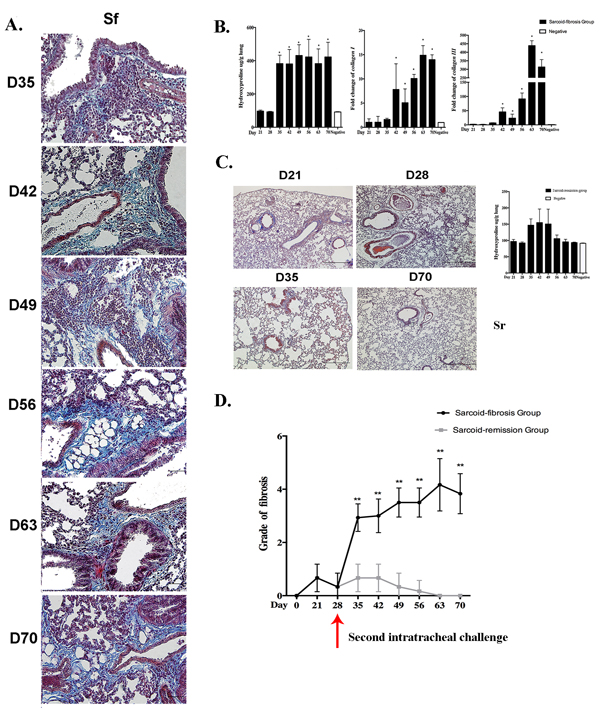 Figure 3: Repeated intratracheal PA challenge induces pulmonary fibrosis following granulomatous inflammation. A. Histological analysis following Masson’s trichrome staining demonstrated pulmonary fibrosis on days 35, 42, 49, 56, 63, and 70 in the sarcoid-fibrosis (Sf) group. Sections are shown at a magnification of ×40 (scale bar = 50 μm). B. Analysis of hydroxyproline compared with negative controls, together with mRNA transcript levels of collagen I and collagen III in sarcoid-fibrosis mice. C. No pulmonary fibrosis was detected on days 21, 28, 35, and 70 in the sarcoid-remission (Sr) group. Hydroxyproline analysis showed no differences between the sarcoid-remission group and the negative control. D. The grade of fibrosis was evaluated in the sarcoid-fibrosis and sarcoid-remission groups at 7-day intervals. Data represent the mean values±S.E.M.*p < 0.05, **p < 0.01.