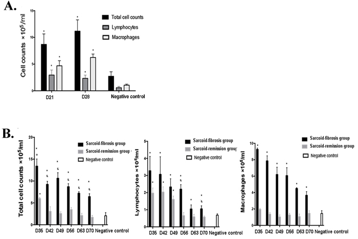 Figure 4: Increased inflammatory cell counts in the bronchoalveolar lavage fluid (BALF) of the sarcoid-fibrosis group mice. A. More inflammatory cells were present in the BALF of sarcoidosis mice on days 21 and 28. B. Repeated PA challenge increased leukocyte recruitment to the lung; *p < 0.05 compared with the negative controls.