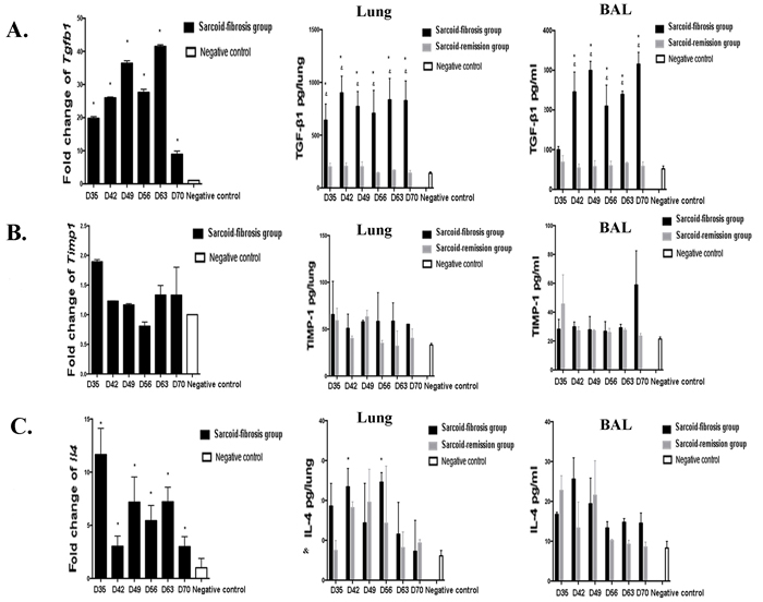 Figure 6: Expression of profibrotic cytokines in mice. The mRNA transcript levels in the lung and protein levels in the lung homogenates and lavage fluid were measured for A. TGF-β1, B. TIMP-1, and C. IL-4. Data represent mean values±S.E.M. *p < 0.05 compared with negative controls; &p < 0.05 compared with the sarcoid-remission group.