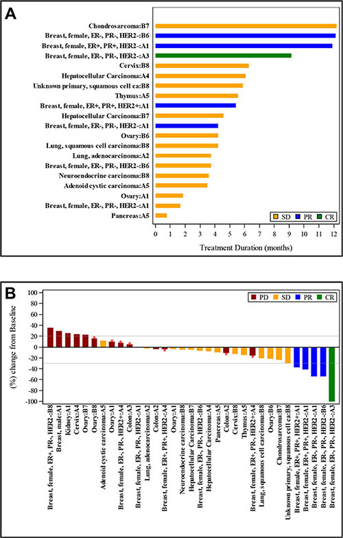 Demographics, adverse events, DLTs, dose levels, and clinical responses were summarized by basic descriptive statistics such as frequency, proportion, mean, median, and range. An ordinal regression method with cumulative logits link was used to determine if there was a statistically significant association (p ≤0.05) between biomarker expression levels (high vs. low/null expression) and the ordinal clinical response (complete response [CR], PR, SD, and progressive disease [PD]).