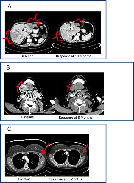 Enrollment of 12 patients with breast cancer on this trial presented an opportunity to gain more information about this therapy in this disease population. An objective response or SD was observed in 58% of breast cancer patients (7 out of 12 patients). Three patients with breast cancer had sustained responses lasting 6 months or more and remained on treatment for 9 to 12 months. All objective responses (1 CR and 4 PR) were seen in patients with breast cancer, including 3 patients with triple-negative disease. All of the patients with triple-negative breast cancer (5 of 5 patients) had stable disease or better on this therapy. One patient with triple-negative breast cancer, previously treated with 7 lines of therapy, achieved a CR and remained on treatment for 9 months. PRs and stable disease were each seen in 2 additional patients with triple-negative breast cancer (4 total patients). Due to these encouraging results suggestive of disease specific activity, a phase II trial in triple-negative breast cancer is under development.