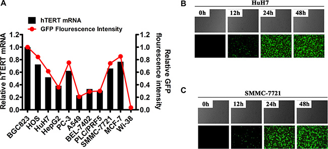 Figure 1: oHSV1-hTERTp-GFP selective replication in human cancer cells. (A) The relative hTERT expression level and GFP fluorescence intensity in human tumor cell lines as determined by real-time RT-PCR analysis and flow cytometry, respectively. Relative hTERT mRNA expression ratios were normalized to the BGC823 cell line. Relative GFP fluorescence intensity was measured 48 hours after oHSV1-hTERTp-GFP transduction at an MOI of 0.1 and normalized to the BGC823 cell line. (B) Fluorescence micrographs showing GFP expression (bottom panels) of EpCAM+ HuH7 cells 48 hours after oHSV1-hTERTp-GFP transduction at an MOI of 1, and corresponding phase-contrast microscopy images of cell morphology (top panels). Original magnification, ×100. (C) Fluorescence micrographs showing GFP expression (bottom panels) of EpCAM-SMMC-7721 cells 48 hours after oHSV1-hTERTp-GFP transduction at an MOI of 1, and corresponding phase-contrast microscopy images of cell morphology (top panels). Original magnification, ×100.