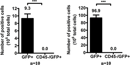 Figure 2: The number of GFP-positive cells per 106 white blood cells after oHSV1-hTERT-GFP infection. The columns marked GFP+ represent the total GFP+ cells investigated by our approach, and GFP+ cells include CD45+ and CD45−. Each value represents the mean ± SED of ten independent samples. ***p < 0.0001.