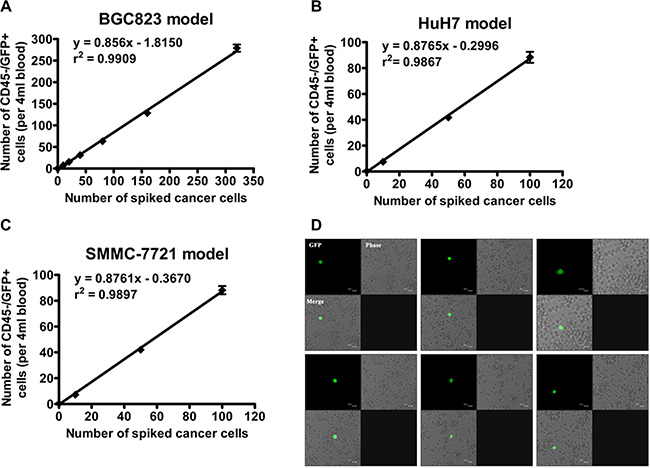 To test the efficacy and accuracy of the oHSV1-hTERT-GFP detection method, variable numbers of human cancer cell lines, including BGC823, Huh7 and SMMC-7721, were spiked into whole blood samples from healthy donors and analyzed using the oHSV1-hTERT-GFP replication methods. As shown in Figure 3A, the recovery rate of BGC823 cells was 75.5–87.2% over the frequency range of cancer cell numbers indicated (Supplementary Table 1). Regression analysis of the number of CD45−/GFP+ cells versus the number of spiked tumor cells showed a strong correlation (r2 = 0.9909). The HuH7 and SMMC-7721 cell tests also exhibited correlation efficiencies of r2 = 0.9876 and 0.9897, respectively (Figure 3B and 3C, Supplementary Tables 2 and 3). The GFP+ cells representing the spiked tumor cells were also visualized by fluorescence microscopy (Figure 3D), and the results suggest that the number of CD45–/GFP+ cells detected by our method was clinically relevant and reflected numbers of CTCs expected in peripheral blood.