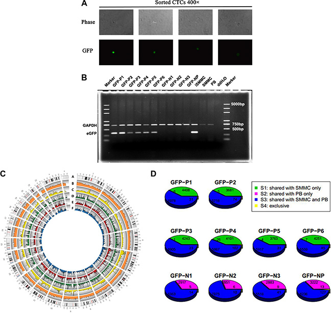 Figure 4: Validation by single-cell sequencing. (A) Single CTCs sorted from peripheral blood samples from healthy donor spiked with 20 of SMMC-7721 cancer cells and observed by fluorescence microscopy. Each panel shows the fields from separate sorts. Original magnification, ×200. (B) The eGFP gene PCR products were analyzed by agarose gel electrophoresis. The order of samples: Marker, GFP-P1, GFP-P2, GFP-P3, GFP-P4, GFP-P5, GFP-P6, GFP-N1, GFP-N2, GFP-N3, GFP-NP, transduced SMMC-7721 cell line (iSMMC, positive control), non-transduced SMMC-7721 cell line (SMMC, negative control), peripheral blood cells of a healthy donor (PB, negative control), ddH2O, and Marker. Upper: GAPDH, lower: eGFP. (C) Circos map of the whole exomes of the unamplified bulk DNA, the pooled cells and 2 single SMMC-7721 cells: A. Karyotype of the human reference genome (Hg19); B. GC content distribution of the whole exome (the heights of the orange rectangles ranged from 0–100%, and the whole exome was divided based on 1 Mb bins of the reference genome); C. Whole-exome depth distribution of the unamplified bulk DNA of the SMMC-7721 cell line (the heights of the yellow rectangles ranged from 0–160X, the whole exome was divided based on 1 Mb bins of the reference genome); D. Whole-exome depth distribution of the pooled cells GFP-NP (the heights of the green rectangles ranged from 0–80X, and the whole exome was divided based on 1 Mb bins of the reference genome); E. Whole-exome depth distribution of cell GFP-P2 (the heights of the red rectangles ranged from 0–20X, and the whole exome was divided based on 1 Mb bins of the reference genome); and F. Whole-exome depth distribution of cell GFP-P3 (the heights of the blue rectangles ranged from 0–20X, and the whole exome was divided based on 1 Mb bins of the reference genome). (D) Comparison of single nucleotide polymorphisms (SNPs) of the amplified DNA products of single-cell samples with unamplified bulk DNA of the SMMC-7721 cell line and peripheral blood cells of a healthy donor: SNPs of each sample were separated into 4 subsets (S1: the green section, consistent with the SMMC-7721 cell line only, S2: the pink section, consistent with peripheral blood cells of the healthy donor only, S3: the blue section, consistent with both the SMMC-7721 cell line and peripheral blood cells, and S4: the yellow section, not consistent with either the SMMC-7721 cell line or peripheral blood cells). Numbers of SNPs belonged to the subsets of each sample were marked on the pie charts. The upper 6 single cells belonged to the GFP-positive population, whereas the lower 3 single cells and the cell pool belonged to the GFP-negative population.