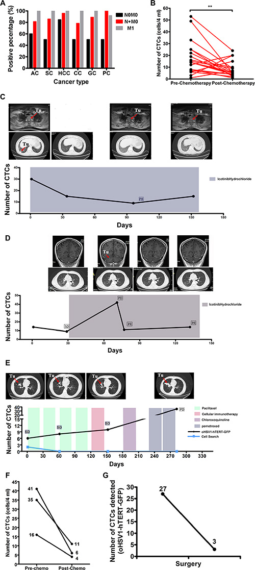 Figure 6: Correlations between CTC-positive rates and cancer stage or treatment response. (A) Positive rates of CTC numbers for patients with cancer at different TNM stages detected by oHSV1-hTERT-GFP. AC: adenocarcinoma (NSCLC); SC: squamous carcinoma (NSCLC); HCC: hepatocellular carcinoma; CC: colorectal cancer; GC: gastric carcinoma; PC: pancreatic cancer. (B) Detection of patients with non-small cell lung cancer (adenocarcinoma) and their CTC numbers during or after chemotherapy. **p = 0.0056. (C) Changes in CTC numbers in response to treatment in a patient with stage III NSCLC using oHSV-hTERT-GFP. The numbers of CTCs were 30, 15, 9, and 15 at different time points, respectively. Upper: spine CT cross-sectional images, Middle: chest CT cross-sectional images, Tu: tumor. (D) CTC changes in response to treatment in a patient with stage III NSCLC using oHSV-hTERT-GFP. The numbers of CTCs were 9, 42, 11, and 14 at different time points, respectively. Upper: brain CT cross-sectional images, Middle: chest CT cross-sectional images, Tu: tumor. (E) CTC changes in response to treatment in a patient with stage III NSCLC using oHSV-hTERT-GFP or CellSearch. The numbers of CTCs were 6, 8, 10, and 36 at different time points for oHSV1-hTERT-GFP, respectively, and 2, 0, 0, and 0 at different time points for CellSearch, respectively. Upper: chest CT cross-sectional images, Tu: tumor. (F) Changes in CTC numbers after chemotherapy of three colorectal cancer cases. (G) Changes in CTC numbers after surgery of colorectal cancer cases.