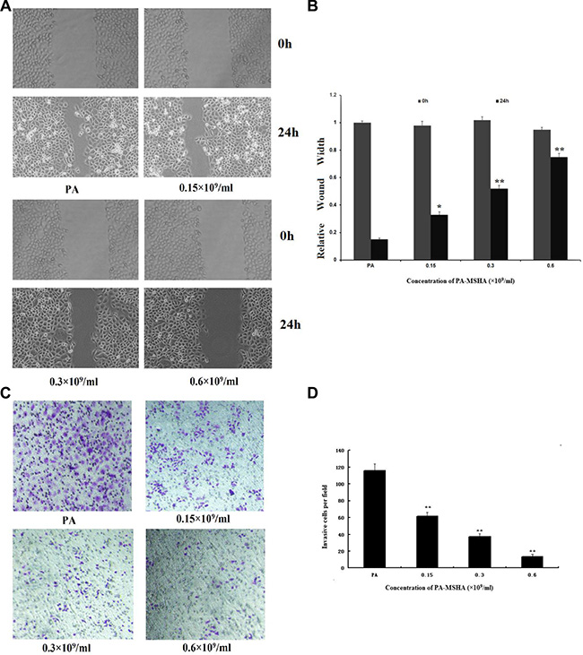 Cells were plated and grown overnight to confluence on a six-well plate. Monolayers of cells were wounded by manual scraping with a 10-μL pipette tip. Cells were rinsed with PBS and then treated with PA (0.3 × 109/mL) or PA-MSHA (0.15, 0.3 or 0.6 × 109/mL) in serum-free medium. Images were taken at 0 and 24 h after wounding under an inverted microscope.