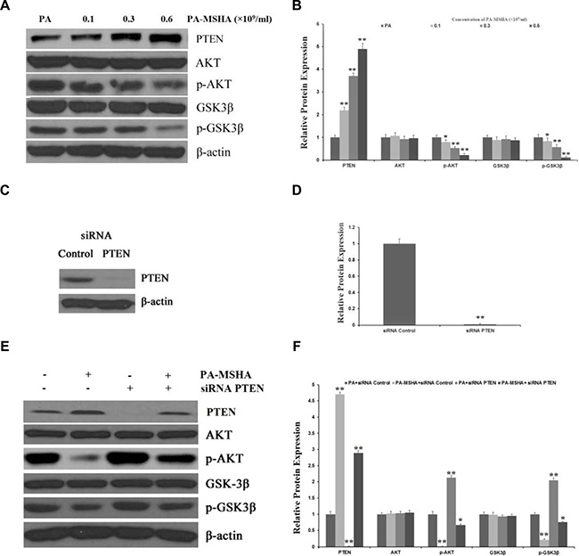 Figure 5: PA-MSHA inhibits the activation of the AKT signaling pathway by increasing PTEN expression. HeLa cells were treated with PA-MSHA or PA. The cells were harvested and the total protein was extracted. (A) The effects of PA-MSHA on the protein levels of AKT, p-AKT, GSK3β and p-GSK3β were assessed by Western blot. (B) The fold-changes in the relative protein levels of AKT, p-AKT, GSK3β and p-GSK3β were calculated with reference to the controls. Data are presented as the mean ± SD (N = 3, **p < 0.01). (C) Cells were transfected with PTEN siRNA or empty vectors, and Western blot analysis was performed to detect PTEN protein levels. (D) The fold-changes in the relative protein levels of PTEN were calculated with reference to the siRNA controls. Data are presented as the mean ± SD (N = 3, **p < 0.01). (E) The inhibitory effect of PA-MSHA on the PTEN siRNA-induced activation of the AKT pathway. (F) The fold-changes in the relative protein levels of PTEN, AKT, p-AKT, GSK3β and p-GSK3β were calculated with reference to the controls. Data are presented as the mean ± SD (N = 3, **p < 0.01).