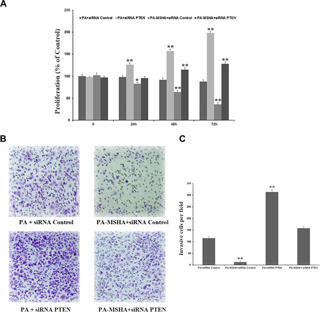 To confirm that PA-MSHA inhibits proliferation and invasion through the PTEN/AKT pathway, we detected the proliferation and invasion of HeLa cells after silencing PTEN and treating cells with PA or PA-MSHA. While PTEN siRNA increased the proliferation (Figure 6A) and invasion (Figure 6B and 6C) of PA-treated HeLa cells, PA-MSHA inhibited the proliferation and invasion induced by PTEN siRNA. These results confirmed that PA-MSHA inhibits proliferation and invasion through the PTEN/AKT pathway.