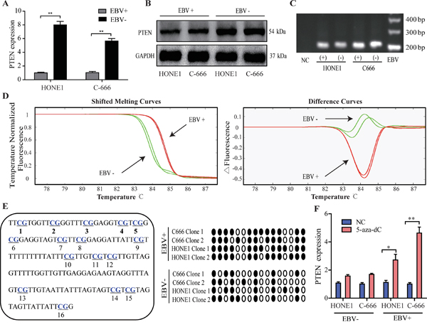 Furthermore, EBV positive or negative NPC cells were incubated with a DNA methylation inhibitor 5-Aza (5-aza-2’-deoxycytidine). 5-Aza obviously restored PTEN expression to a higher extent in EBV-positive cells than EBV-negative cells (Figure 1F).
