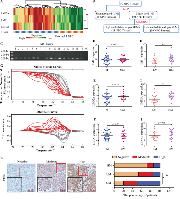 Figure 2: Higher methylation intensity of PTEN CpG islands in NPC specimens with EBV infection. A. Hierarchical clustering of the EBNA1, LMP2A, LMP1 expression levels was generated by R programming language based on quantitative PCR results in NPC and NP samples. High and low expressed genes are shown by red and green, respectively. B. NPC tissues were divided into methylated (M) and unmethylated (UM) groups based on the MSP analysis results, and then the methylated group was subdivided into the high methylation intensity (HM) and low methylation intensity (LM) groups based on the MS-HRM analysis. C. Detection of methylation status of PTEN in NPC samples. D-F. Average expression levels of LMP1, LMP2A and EBNA1 in M and UM groups based on MSP analysis. G. MS-HRM results of the 40 methylated NPC tissues. Melting curves of the methylated NPC tissues as well as the corresponding difference curves are shown. The grouping is as calculated by the LightScanner software. H-J. Average expression levels of LMP1, LMP2A and EBNA1 in HM and LM group. mRNA abundance was normalized to GAPDH mRNA. K. Immunohistochemistry detection of PTEN protein in patients with NPC. Left, representative IHC of NPC samples, showing the negative, moderate and high expression level of PTEN, respectively. Right, the percentage of patients with the negative, moderate and high expression of PTEN protein in UM, LM and HM groups. Each bar represents the means ± SD of three experiments. *p<0.05, **p<0.01.