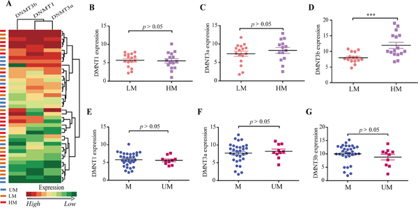 Figure 3: DNMT gene expression in different groups. A. Hierarchical clustering of the DNMT1, DNMT3a, DNMT3b expression levels was generated by R programming language based on quantitative PCR results in NPC samples. High and low expressed genes are shown by red and green, respectively. B-D. Average expression levels of DNMT1, DNMT3a, and DNMT3b in LM and HM groups. E-G. Average expression levels of DNMT1, DNMT3a, and DNMT3b in M and UM groups. mRNA abundance was normalized to GAPDH mRNA. Each bar represents the means ± SD of three experiments. UM, unmethylated. M, methylated. LM, low methylation intensity. HM, high methylation intensity.