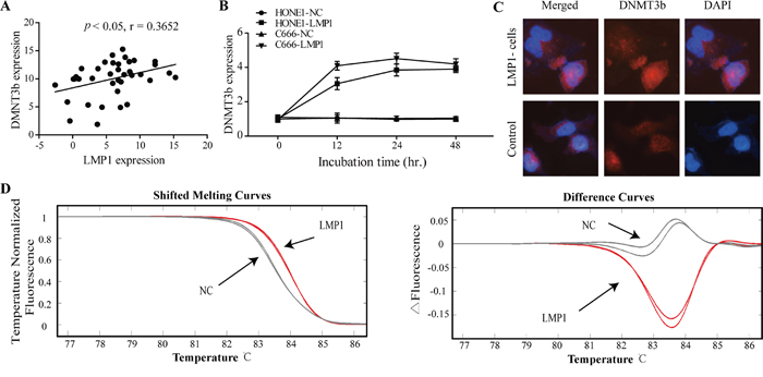 Figure 4: Activation of DNMT3b by EBV LMP1 induces the higher CpG island methylation intensity. A. A statistically significant positive correlation between LMP1 and DNMT3b mRNA expression levels in NPC specimens (Spearman's correlation analysis, r =0.365, P < 0.05). B. Quantitative real-time analysis of DNMT3b in EBV-negative NPC cells (C666 and HONE1), induced by transient transfection of LMP1 gene. C. Immunofluorescence (400X) was done to visualize the expression and nuclear accumulation of DNMT3b between control and LMP1 gene-transfected NPC cells. D. HRM results of the control and LMP1 gene-transfected NPC cells. Melting curves of the methylated NPC tissues as well as the corresponding difference curves are shown.