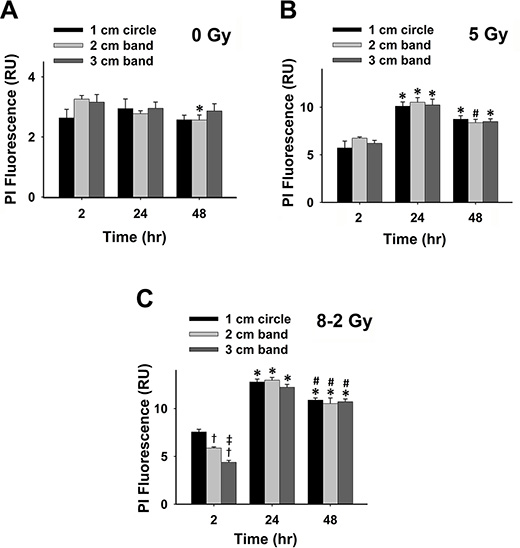 Figure 4: Grouped data of cell viability represented by PI fluorescence; 2 h vs. 24 h vs. 48 h (measured from three randomly selected areas of 300–500 cells in 1 cm circle, 2 and 3 cm bands, respectively; mean ± SE). (A) PI fluorescence measured from 1 cm circle, 2 and 3 cm bands of control. (B) PI fluorescence measured at 1 cm circle, 2 and 3 cm bands in UI (5 Gy). (C) PI fluorescence measured at 1 cm circle, 2 and 3 cm bands in GI (8–2 Gy). *p < 0.05 vs. 2 h at the same circle/band; #p < 0.05 vs. 24 h at the same circle/band; †p < 0.05 vs. 1 cm circle at the same time; ‡p < 0.05 vs. 2 cm band at the same time.
