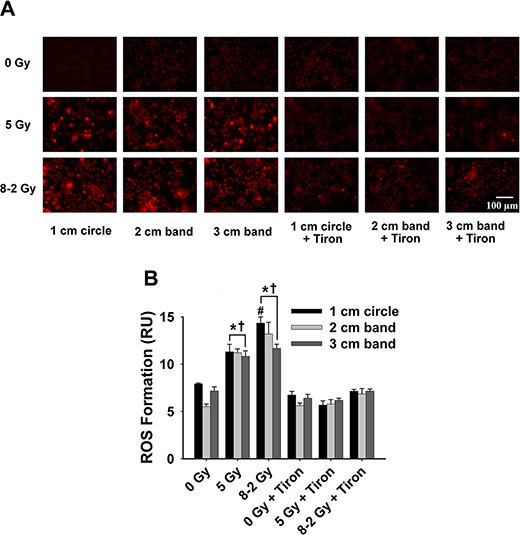 Figure 7: Intracellular ROS formation at 24 h after irradiation detected by DHE/ET fluorescence; data were measured from three randomly selected areas of 300–500 cells in 1 cm circle, 2 and 3 cm bands, respectively; 0 Gy ± Tiron vs. 5 Gy ± Tiron, and 8–2 Gy ± Tiron. (A) Representative images of ROS formation (shown by red fluorescence); (B) Grouped ROS formation in 1 cm circle, 2 and 3 cm bands (mean ± SE); *p < 0.05 vs. 0 Gy at the same circle/band; #p < 0.05 vs. 5 Gy at the same circle/band; †p < 0.05 vs. Tiron-treated group at the same circle/band and at the same dose.