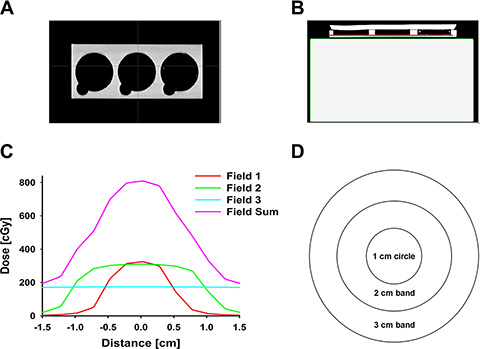 Figure 10: Irradiation design. (A) Coronal slices of acrylic blocks with three cell plate holders; (B) Axial slices of acrylic blocks and solid water slabs (the red line indicates where the dose profiles to be taken); (C) Typical dose profiles of field 1 (orange), 2 (green), 3 (cyan), and the summation of the three fields (purple). Each plate was irradiated by three fields: Field 1, field size 1 cm × 1 cm, 500 MU, dose rate 600 cGy/min, energy 6 MV; Field 2, field size 2 cm × 2 cm, 400 MU, dose rate 600 cGy/min, energy 6 MV; Field 3, field size 5 cm × 5 cm, 200 MU, dose rate 600 cGy/min, energy 6 MV. Overlaps of the three fields generated a gradient dosage profile ranging from ~ 8 Gy at dish center to ~ 2 Gy at the edge of the irradiation dish; (D) A simplified diagram of three defined irradiation regions by their distances from the center of the plate: 1 cm circle, 2 cm circular band, and 3 cm circular band.