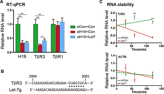 Figure 2: TβR3 is a target of the H19/let-7-mediated regulation. (A) HTR cells were transfected with siCon plus iCon, siH19 plus iCon or siH19 plus iLet7. RNAs were extracted 48 h later and analyzed by RT-qPCR. The indicated RNA levels relative to those of the control (siCon+iCon, which were arbitrarily set as 1) are presented. One-sample t tests were performed to compare each data point with the siCon+iCon control. Numbers are mean ± SD (n = 3). **p < 0.01. (B) Schematic presentation of let-7g-binding site in TβR3 mRNA 3′-UTR. Partial sequence of human TβR3 (top) and the sequence of let-7g (bottom) are shown. Base-paired interactions between the microRNA seed region (position 2 to 8) and the target mRNA are indicated by dots. Numbers are in nucleotides relative to the transcriptional start site of TβR3. (C) HTR cells were transfected with Let-7 or miCon in the presence of the RNA polymerase inhibitor actinomycin D. RNAs were extracted at 0, 30, 60, and 120 minutes following incubation with the transfection mixture. TβR3 (upper panel) and beta-actin mRNA (bottom panel) levels were determined by RT-qPCR. Results are presented after normalization against beta-tubulin mRNA. Numbers are mean ± SD (n = 3). **p < 0.01.