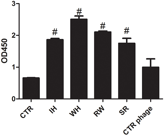 Figure 1: ELISA of the selected phage clones toward Clec9a-CTLD protein. 10μg Clec9a-CTLD protein was coated into the ELISA plate at 4 °C overnight. The next day, the plate was washed 3 times with TBS buffer containing 0.05% Tween 20 and blocked with 5% BSA buffer. 1 × 107 phages were added for 2 hours at room temperature. The anti-M13 protein with HRP and 1×TMB buffer were used. Finally, 50 μL 1mM H3PO4 stop buffer was added and plate was read at 450nm. #: twice higher than control group (CTR, without phage). CTR phage: phage that do not have random peptide sequence inserted.