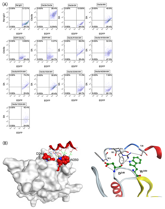 Figure 3: Binding of peptide WH toward Clec9a mutants and the docking model. PEP-FOLD was used to mimic the structure of peptide WH, and then these structures were docked to mouse Clec9a crystal structure for predicting the key binding residues of Clec9a. A. Seven Clec9a single amino acid mutation plasmids were transfected into HEK-293T cells. The staining procedure was same as that described in Figure 2. B. The left figure showed the docking model of peptide WH with mClec9a. The right figure showed that the key interaction forces less than 4.5Å of peptide WH bind to D248 or W250 of Clec9a.