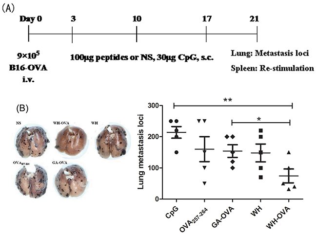 Figure 6: The antitumor effects of peptide WH-OVA257-264 in B16-OVA melanoma lung metastasis model. 9×105 B16-OVA melanoma cells were injected intravenously in C57Bl/6J mice to establish the lung metastasis model. 3 days later, 100μg WH-OVA/OVA257-264/WH/GA-OVA or NS was injected s.c. with CpG ODN 1826 (30μg) weekly for three times, then the lungs were processed to count the metastasis loci, and the splenocytes were isolated and re-stimulated by OVA257-264 (10μg/mL) for 5 days. A. The scheme of tumor model, immunotherapy and ex vivo analysis. B. The effects of peptide WH-OVA257-264 on the number of lung metastasis loci. C. Supernatant IFN-γ determined by ELISA. D. The perforin and granzyme B mRNA expression fold change. Data are presented as means ± SEM (n=5), *P<0.05, **P<0.01. Data are representative of two experiments.