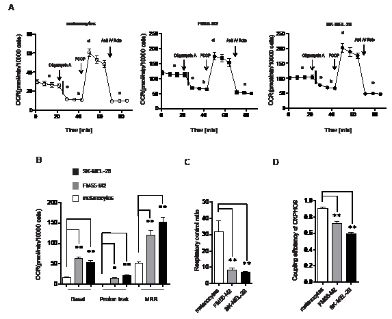 Figure 2: Mitochondria in melanoma cells consume oxygen but exhibit dysfunctional OXPHOS. (A) OCR (pmol/min/10000 cells) in melanocytes and melanoma cells (FM55-M2 and SK-MEL-28) following sequential addition of oligomycin (1 µM), carbonylcyanide-p-trifluoromethoxyphenylhydrazone (FCCP) (optimized to 0.5 µM in FM55-M2 and SK-MEL-28 cells and 1.2 µM in melanocytes) and a mixture of antimycin A (Anti A; 2.5 µM) and rotenone (Rote; 2.5 µM). Different states of mitochondrial respiration are marked in the figure; basal respiration (a), proton leak (b), oligomycin sensitive respiration (c= a-b), maximal respiratory rate (MRR, d) and non-mitochondrial respiration (e). (B) Comparison of mitochondrial respiratory states (basal respiration, proton leak and MRR) in melanocytes and melanoma cells following corrections for non-mitochondrial respiration. (C) Calculation of the respiratory control ratio (RCR) (d/b) and (D) the coupling efficiency of OXPHOS (c/a) in melanocytes and melanoma cells. Data are presented as the means ± SD (n = 12) from one experiments and are representative of three independent experiments. Statistical analyses (B, C and D) were performed with one-way ANOVA, using Tuckey’s multiple comparisons test to calculate significance (* = p < 0.05; ** = p < 0.01).
